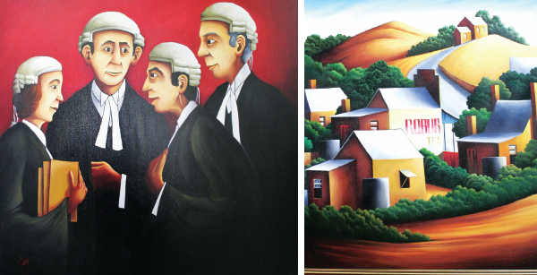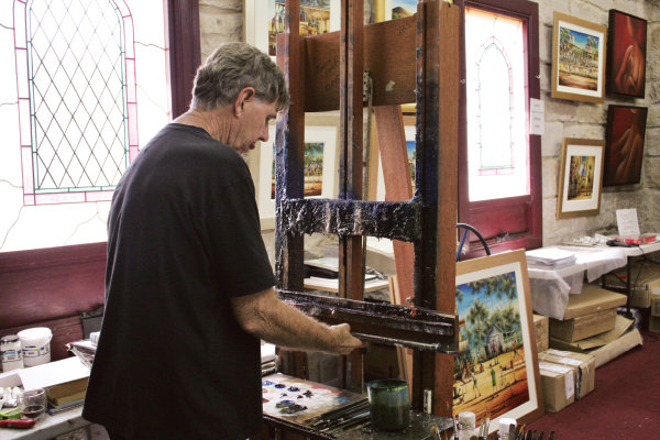 His studio, neatly ensconced in an old sandstone church that bears the chisel marks of hand swung picks, seems perfectly suited to housing his many works. Here are quintessential scenes of Australiana, with characters that could only be laconic country Aussies, in vivid, arresting colours that seem to be accentuated by the tawny colours of the sandstone walls.