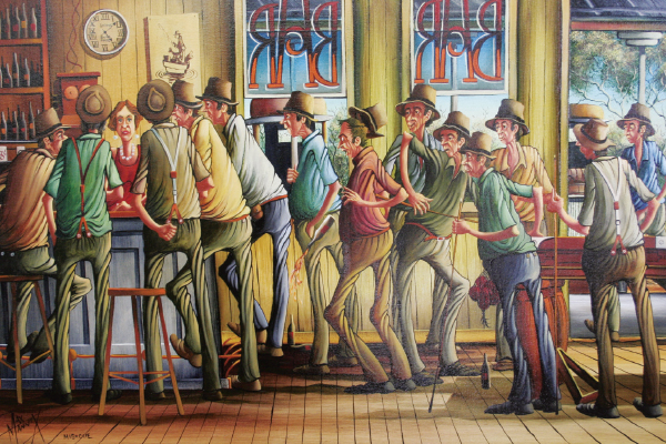 His unique style of character painting soon emerged, with a distinct Australian flavour, overlaid with a laconic, almost comical view of life expressed through the characters’ expressions and poses.